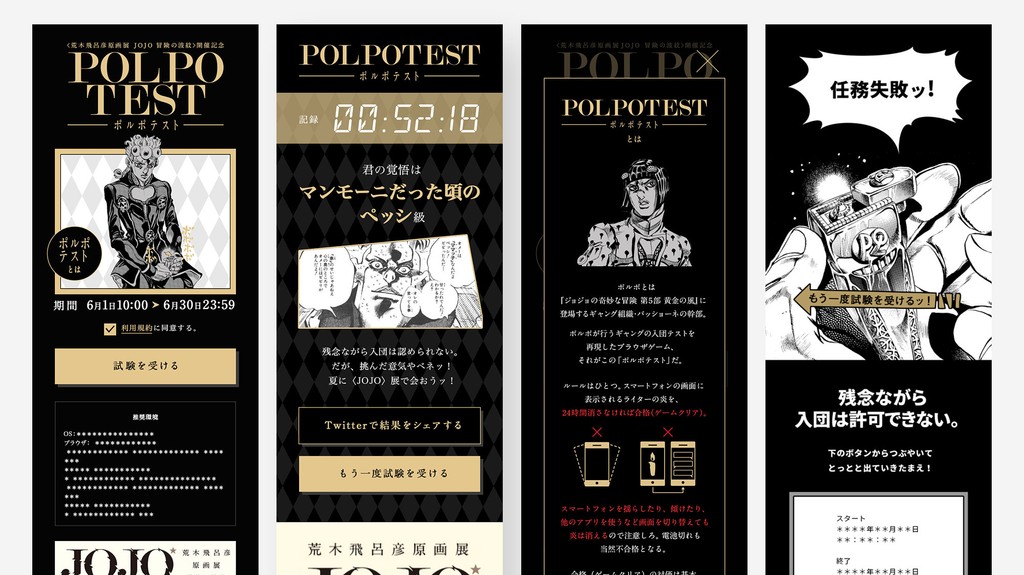 森美術館でのJOJO展開催に合わせて、JOJO第五部のマフィア所属試験を模したキャンペーンを制作。漫画の主人公が行ったテストを追体験できるということでSNSを中心に話題になった施策でした。