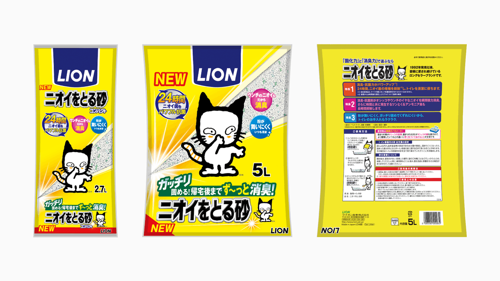 LIONから発売している、猫砂のパッケージデザイン。この猫砂は2010年に発売してからのベストセラーで商品です。2015年に全面リニューアルを行い、そのデザインを一人で担当しました。