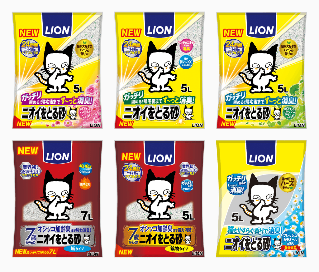 この商品には香り付きのタイプや、高齢猫用のタイプなど様々な種類が展開されています。高齢猫になると、尿の匂いが強くなっていくので高齢猫用のタイプはより消臭力の強い商品になっています。デザイン面でも色をガラッと変えて差別化し、商品タイトルも高級なエンブレムのようなあしらいを施しました。