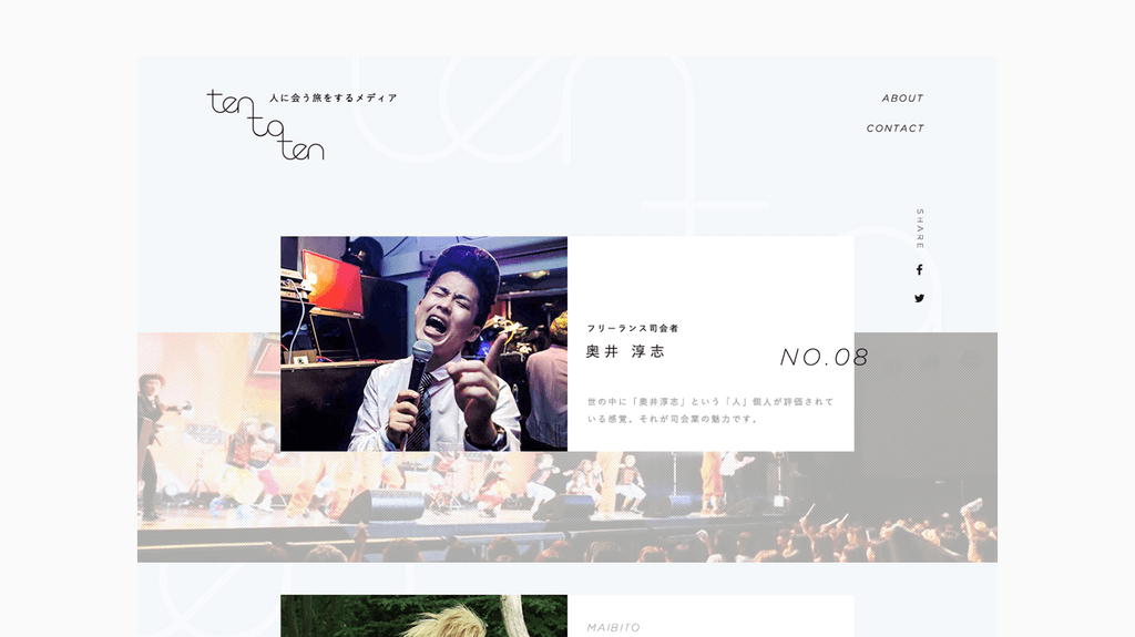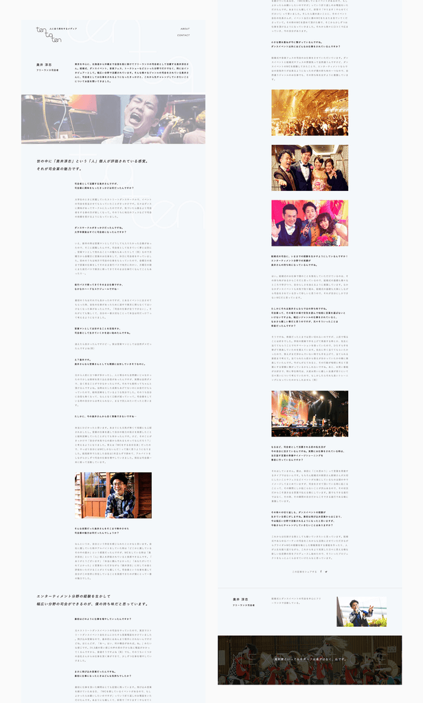 tentotenは自身が運営するメディアサイトです。さまざまな分野で活躍する人々に焦点を当てたインタビュー記事を掲載していました。それぞれの仕事にかける情熱やこだわり、日々の業務に込めた想いを掘り下げるとともに、その背景にあるこれまでの人生や経験についても紹介していました。